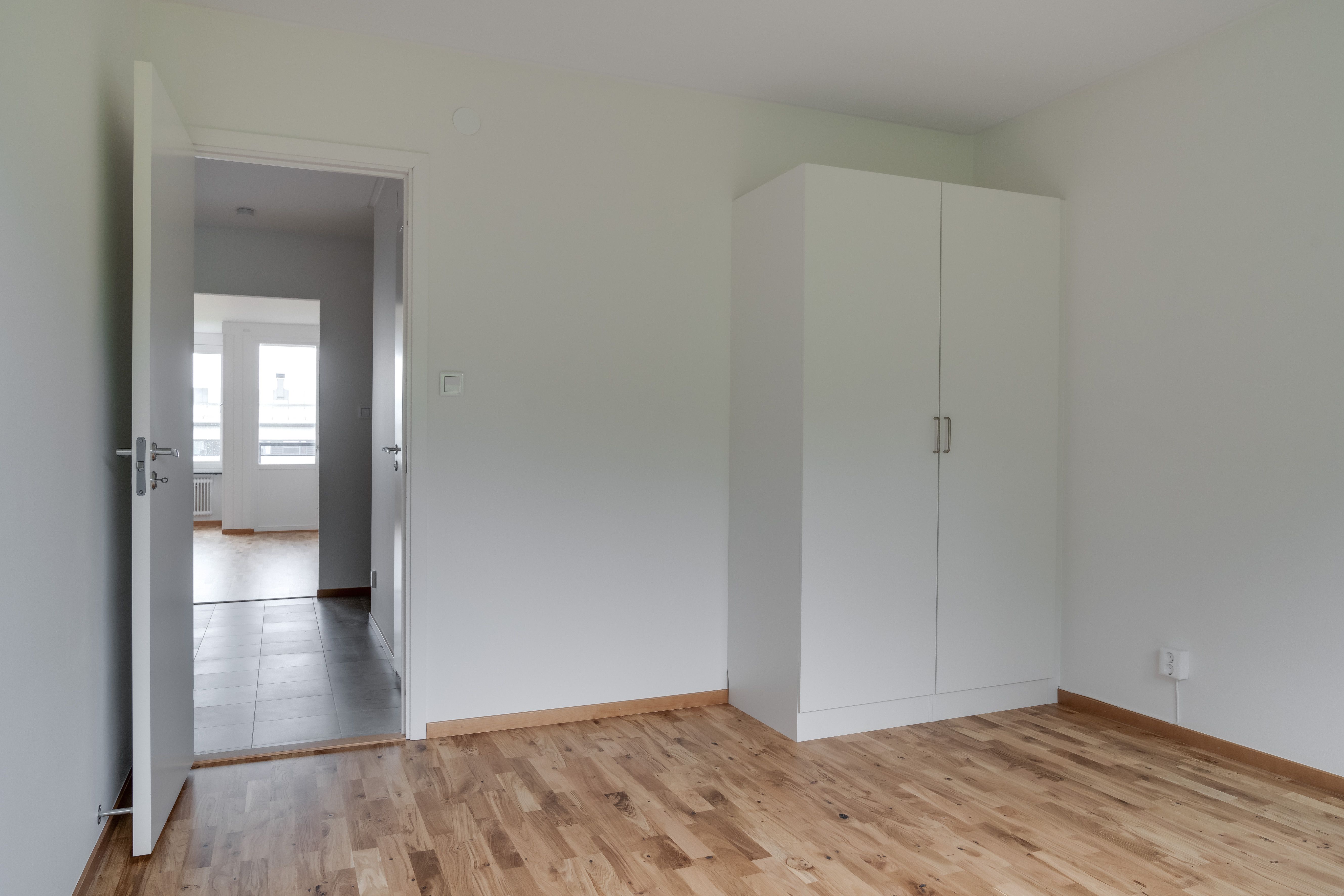 Hela lägenheten har ekparkett på golvet med undantag en bit av entrén i hallen som har grått klinkergolv, alla väggar är vitmålade och fristående garderober finnas på plats.