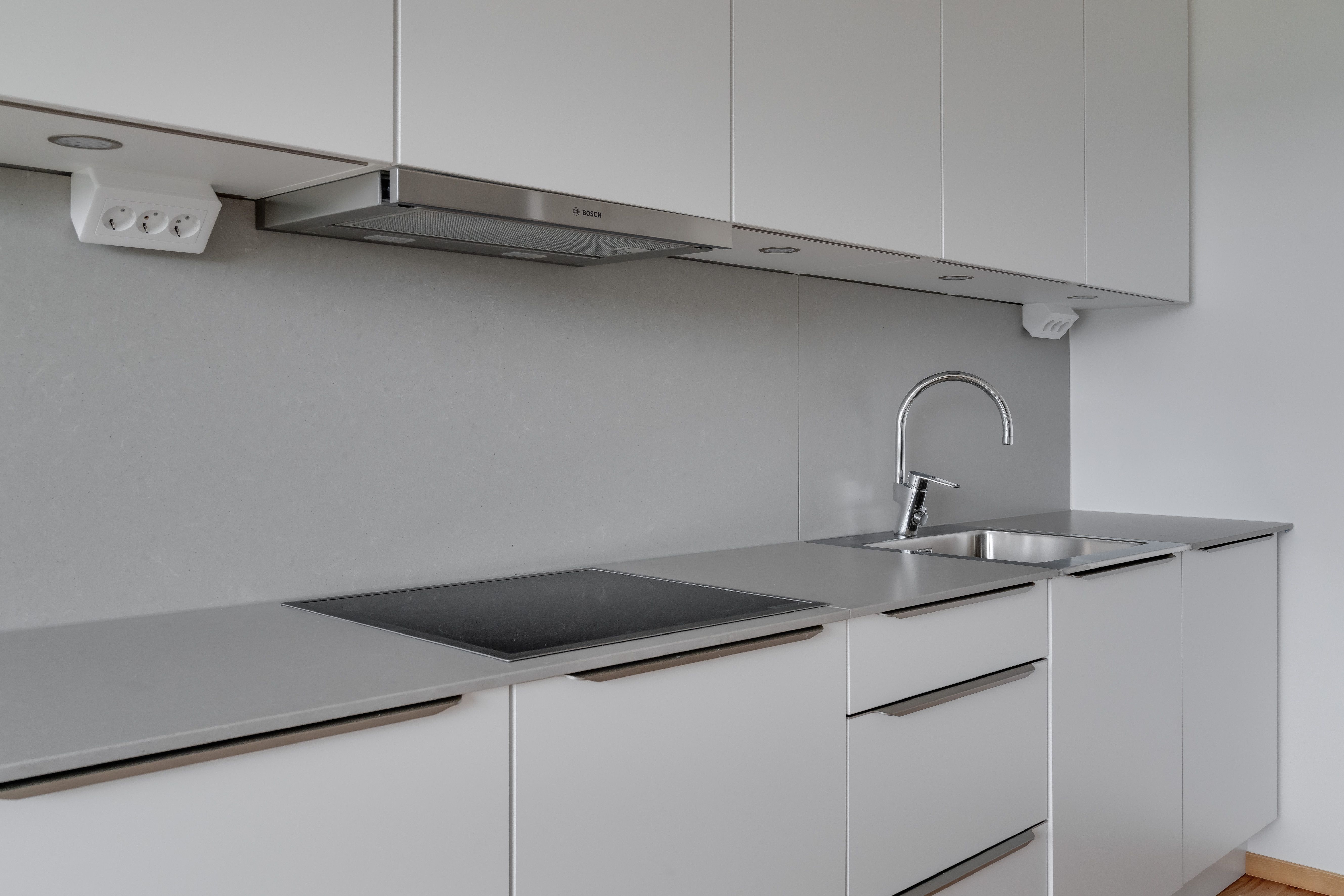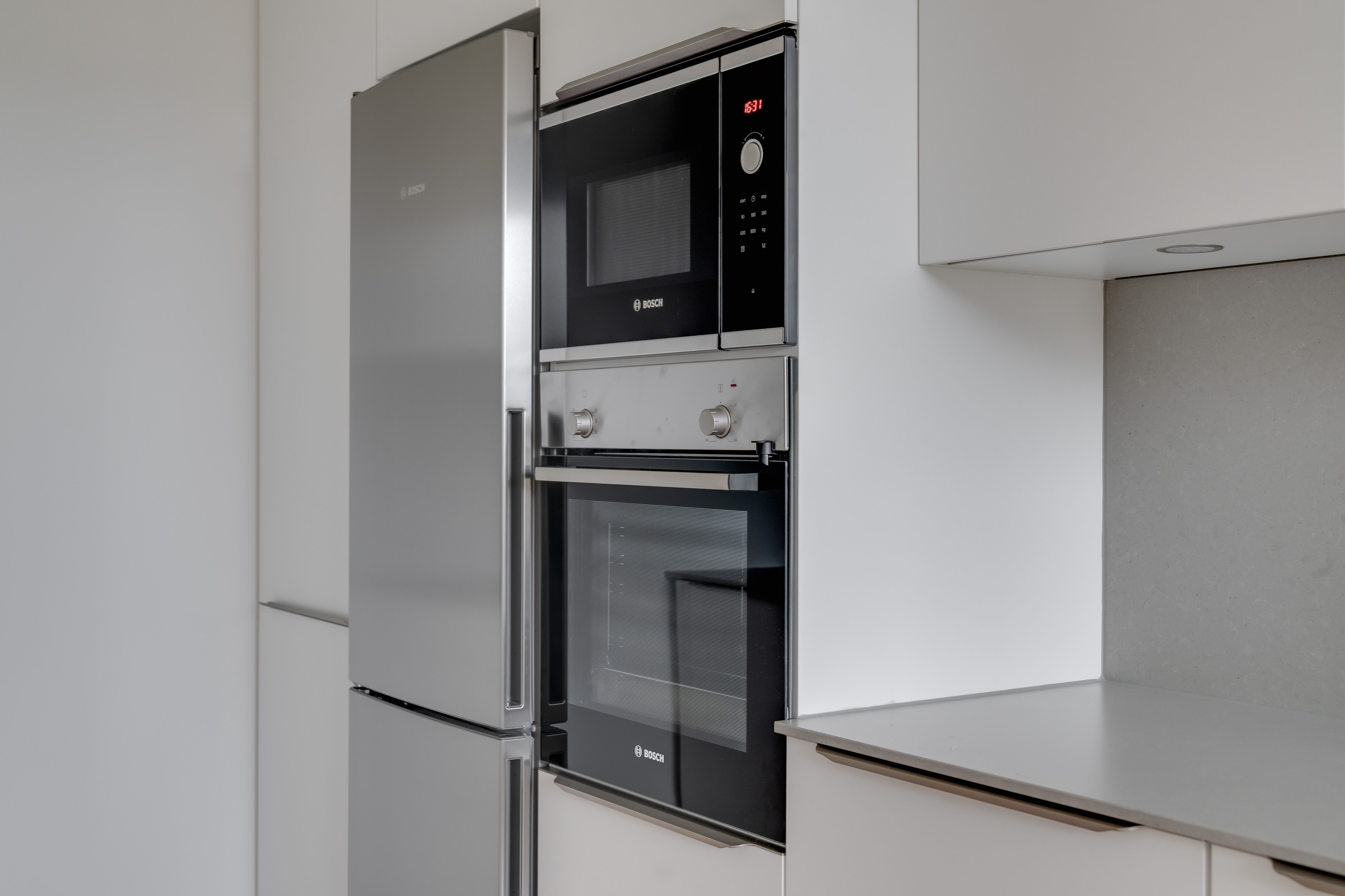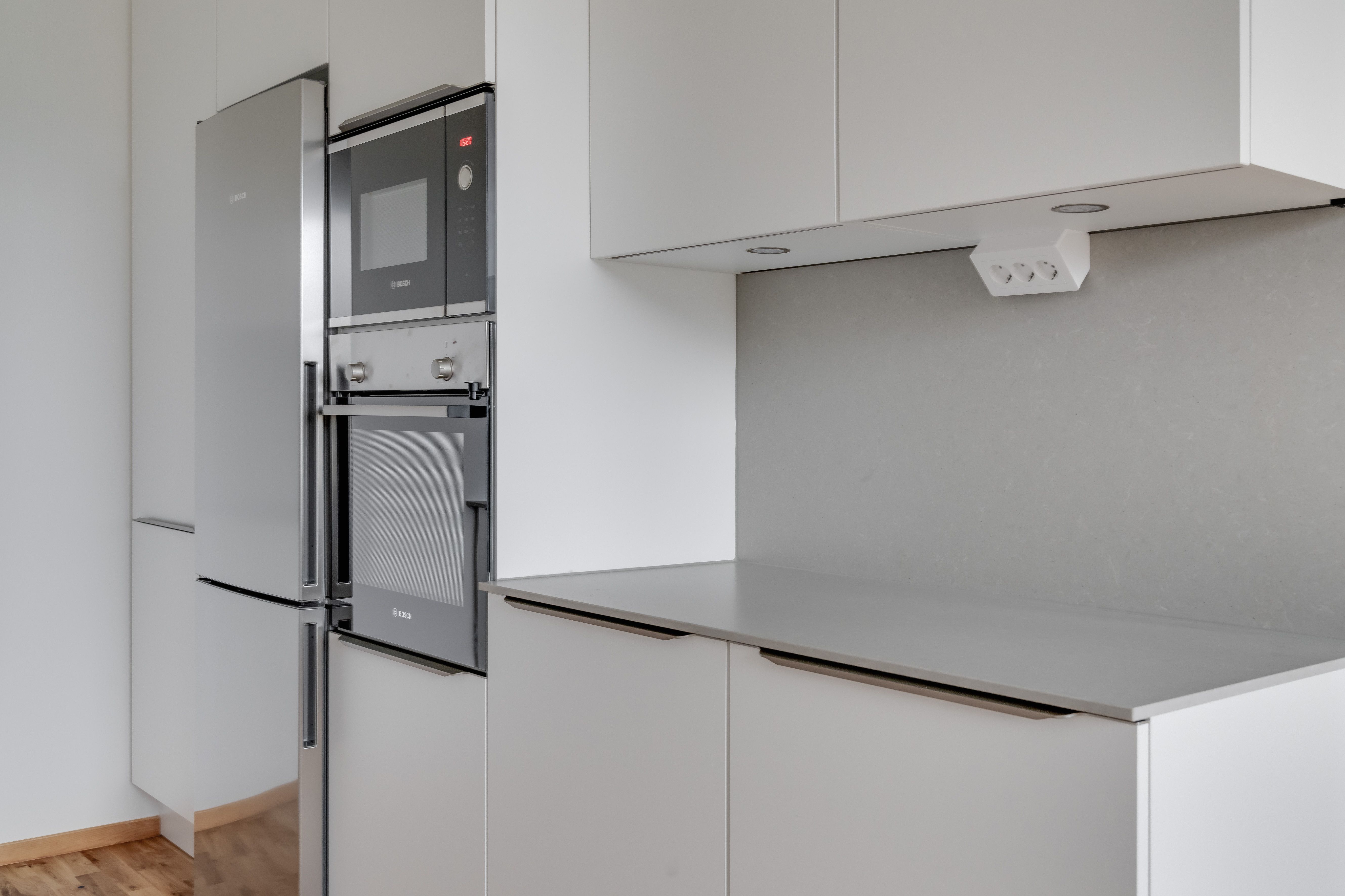 Köket är utrustat med släta vita luckor, bänkskiva i kvartskomposit och rostfria energisnåla vitvaror, såsom glaskeramikhäll, inbyggnadsugn, kombinerad kyl/frys, inbyggd mikrovågsugn och utdragbar spisfläkt. Köket har även en integrerad diskmaskin.