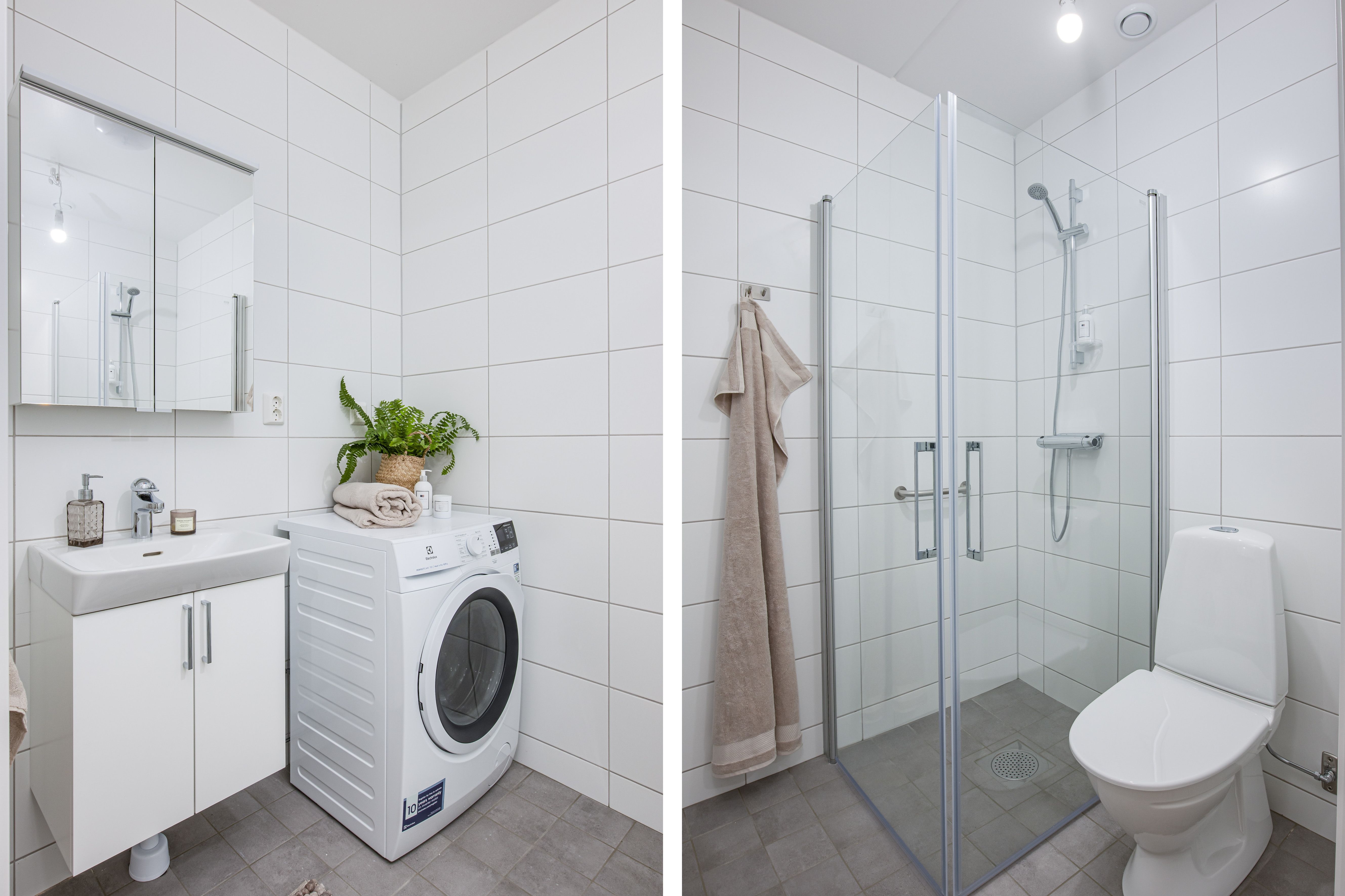 Badrummen är helkaklade med vitt kakel på väggar och grå klinkers på golv. Spegelskåp ovanför handfatet med en vit kommod, duschväggar och tvätt- och torkmöjligheter i lägenheten är standard.