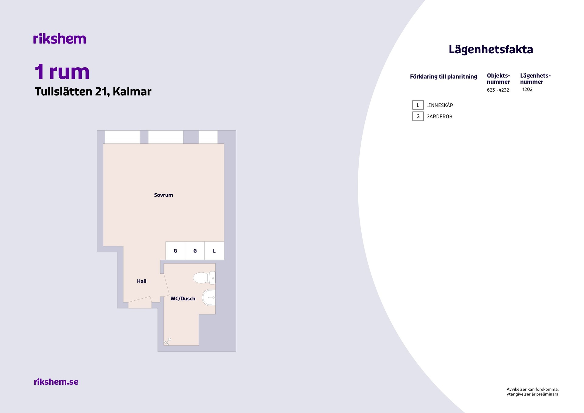 Rikshem reserverar sig mot eventuella fel eller avvikelser som kan förekomma i lägenhetsannonsen eller i planritningen.